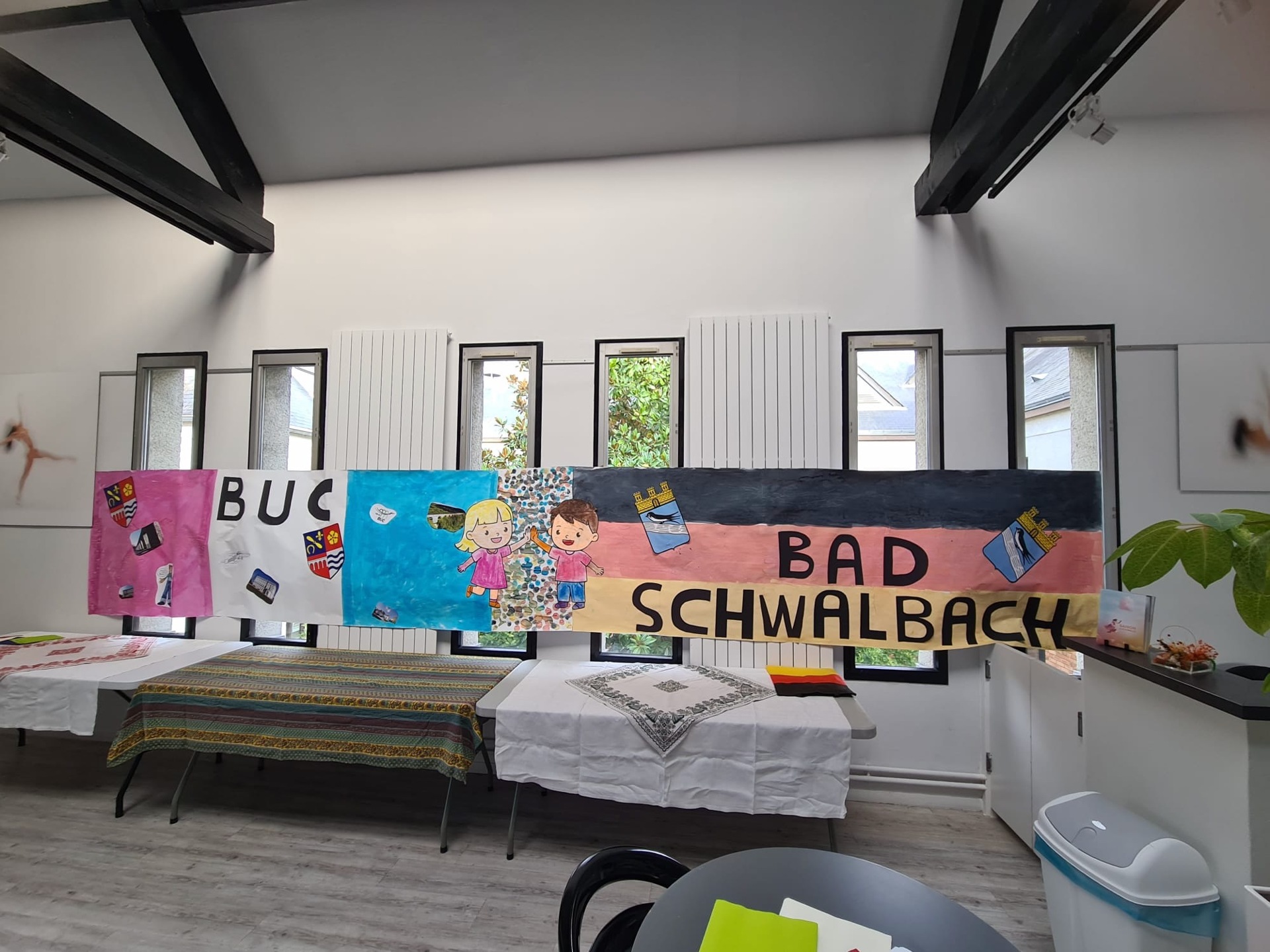 Lors du dîner, le comité de jumelage a remis à nos partenaires allemands une fresque réalisée par les enfants du centre de loisirs, représentant leur vision de Buc. Cette fresque sera bientôt complétée par les enfants de Bad Schwalbach, qui y ajouteront les monuments et symboles de leur ville.